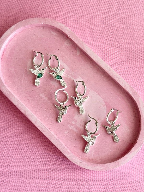 Argollitas de acero blanco con dijes colgantes en forma de colibrí 🌸. Diámetro de 1 cm.
