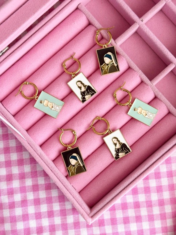 Argollitas de acero dorado 💫 con dije colgante en forma de cuadro! Su diámetro es de 1 cm.