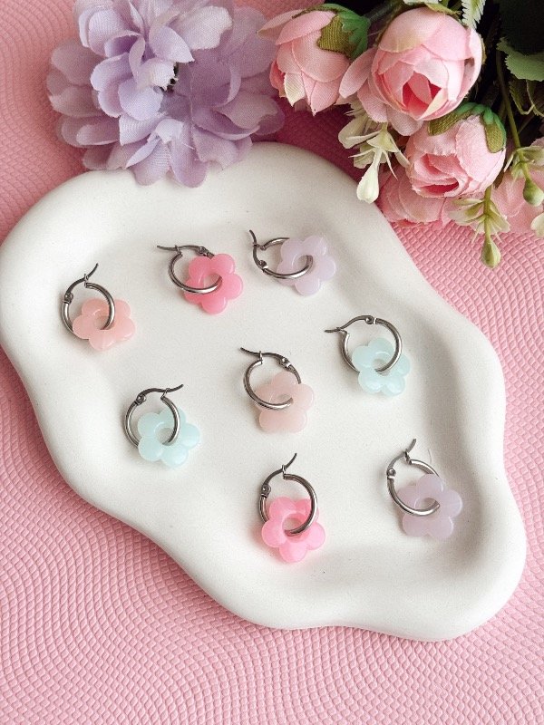 Argollitas de acero quirurgico con dijes desmontables en forma de flor acrílica de color 🌈 Miden 1,8 cm de diámetro