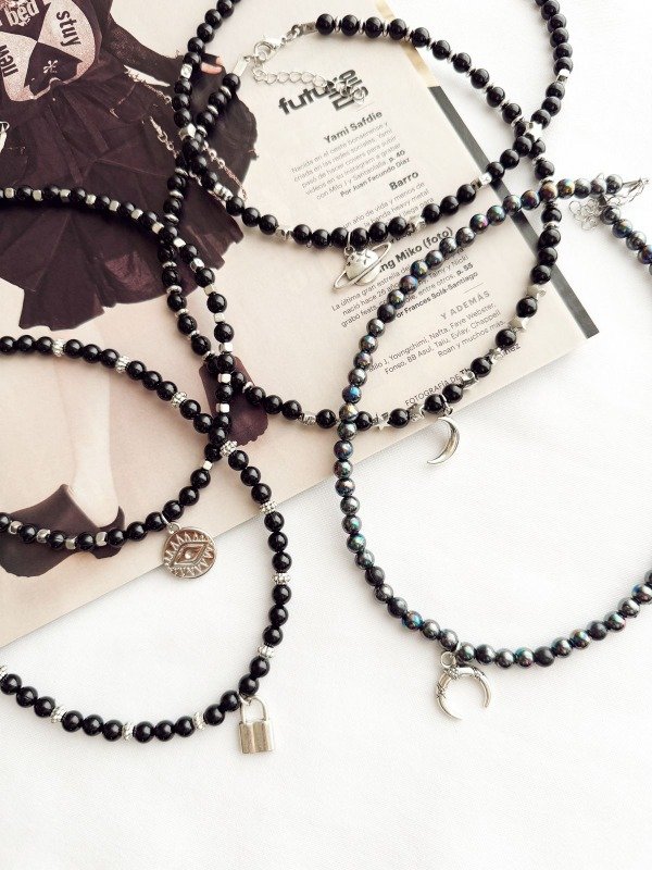 Collares de cuentas plásticas perladas y negras. 38 cm de largo + 5 cm de alargue extra.