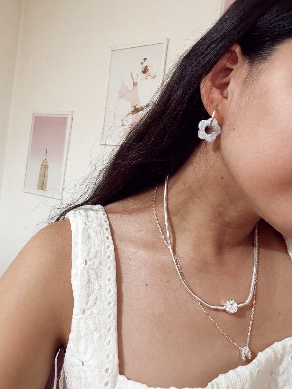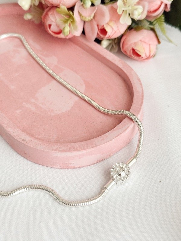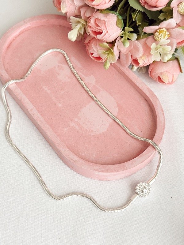 Cadenita tubular de acero blanco 馃┒ Mide 45 cm de largo con cierre estilo Pandora en forma de margarita con strass 馃馃徎馃専