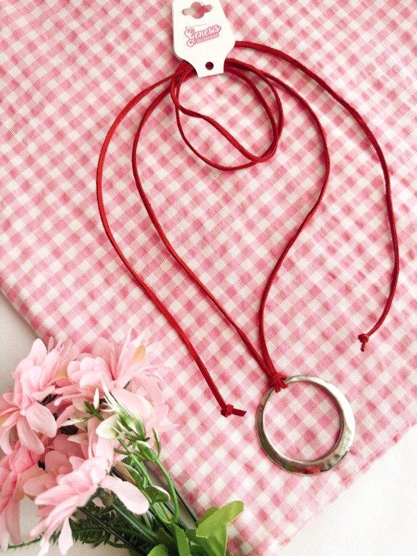 Choker regulable de 1,50 mts de largo. Adaptable a varias formas de uso. Gamuza nobuk color rojo.