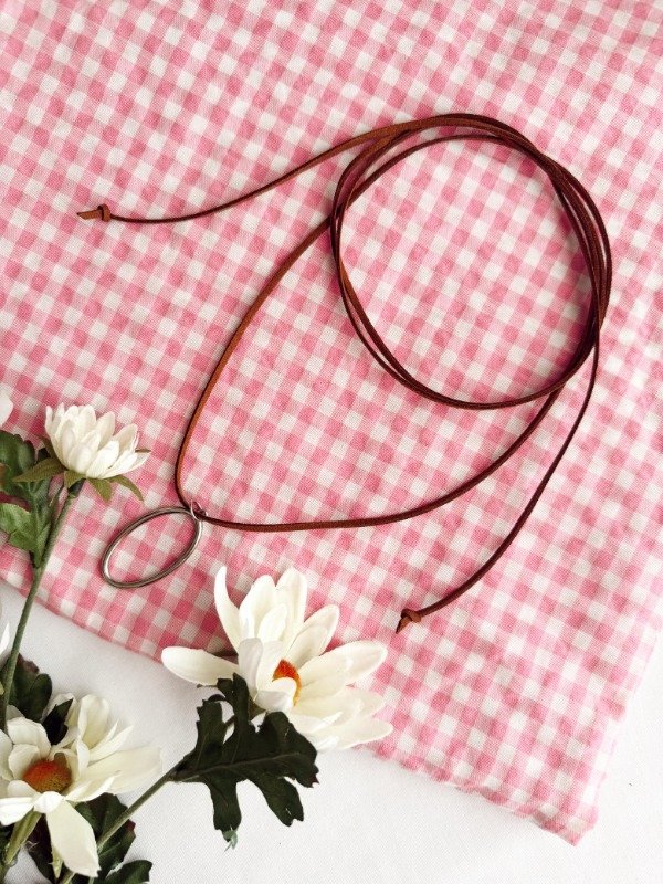 Choker regulable de 1,50 mts de largo. Adaptable a varias formas de uso. Gamuza nobuk color marrón.