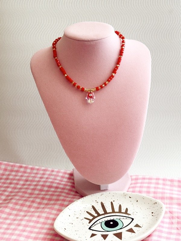Collar de cristal de roca 4 mm con dije de vidrio. 36 cm de largo con 5 cm de cadena fundición de alargue.