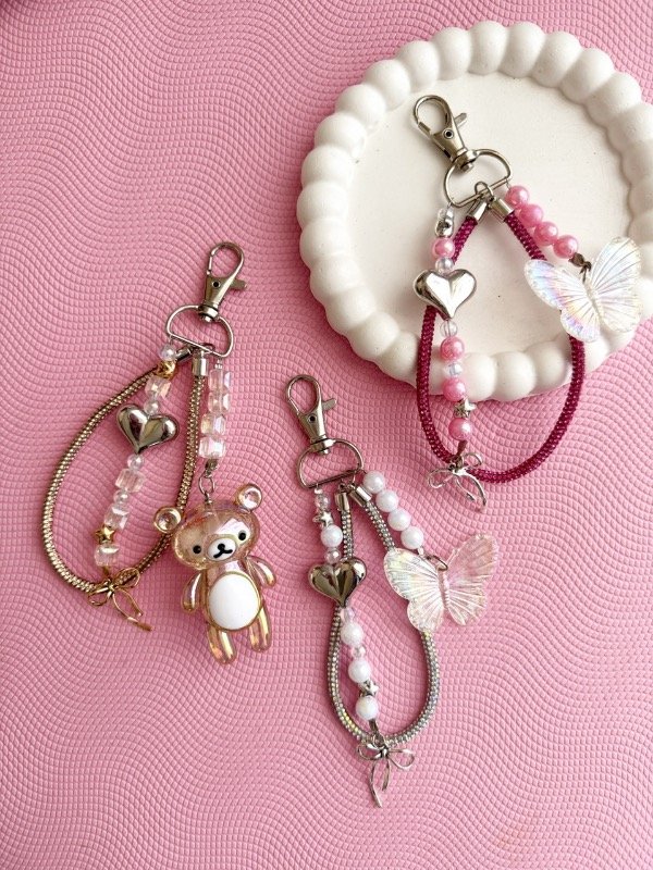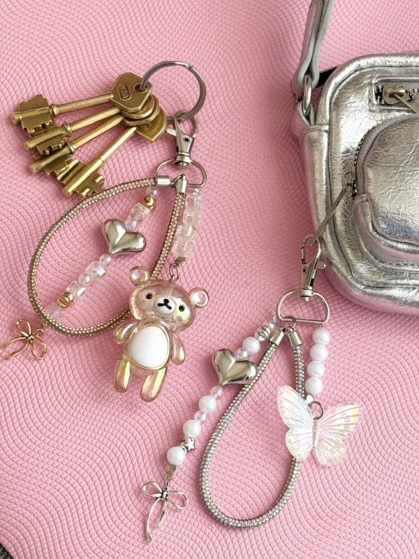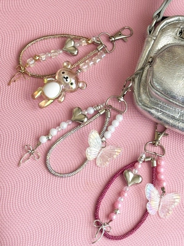 Llavero con cierre metálico súper reforzado y charms colgantes junto a una correa de Strass 100% delicada 🩷🌸😉