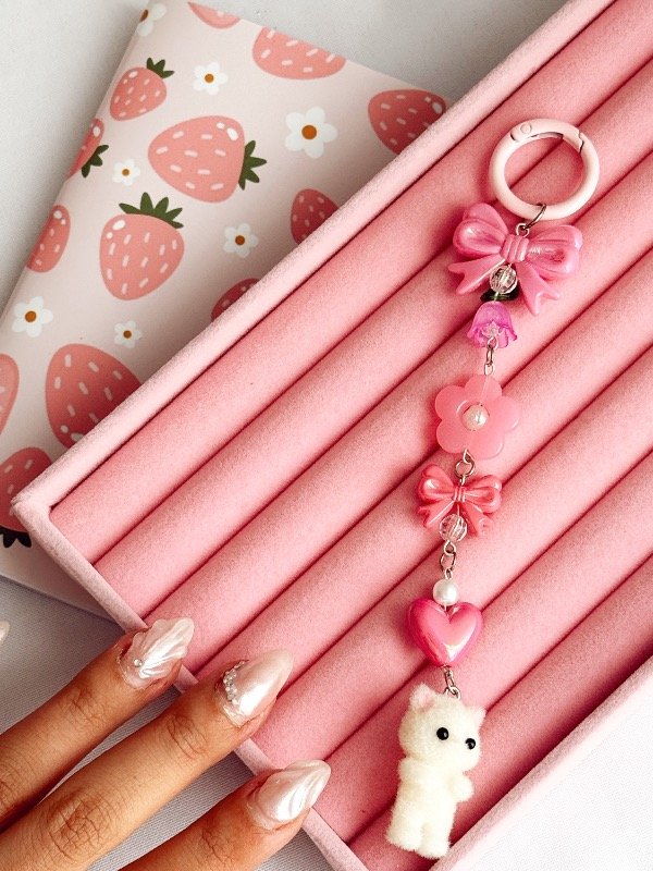 Llavero hecho 100% a mano 馃檶馃徏 con cuentas pl谩sticas de colores y un dije de terciopelo en forma de mascota 馃挆