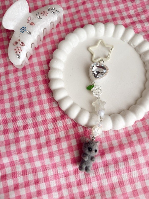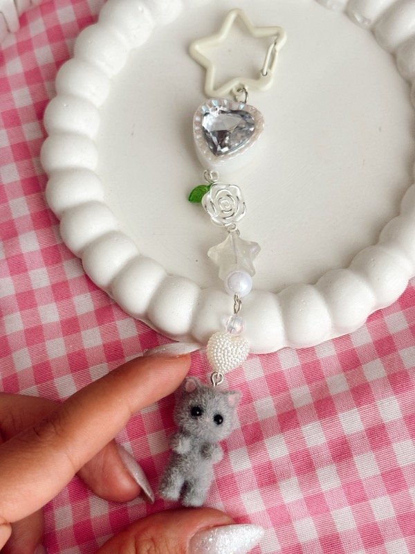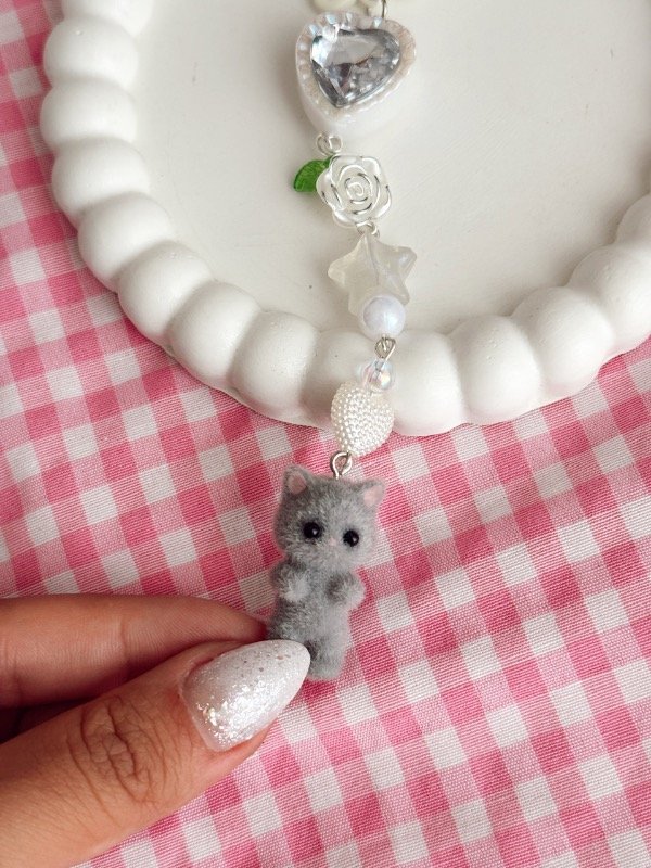 Llavero hecho 100% a mano 馃檶馃徏 con cuentas pl谩sticas de colores y un dije de terciopelo en forma de mascota 馃挆