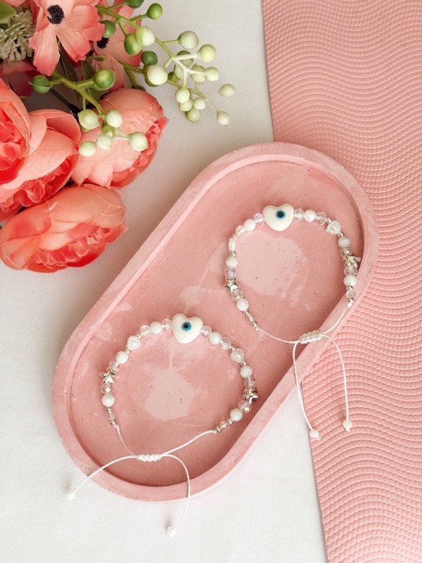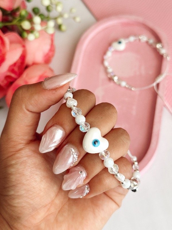 Pulsera regulable de cristal de roca con dije pasante en forma de corazón de la suerte de cerámica 🩷✨🍀