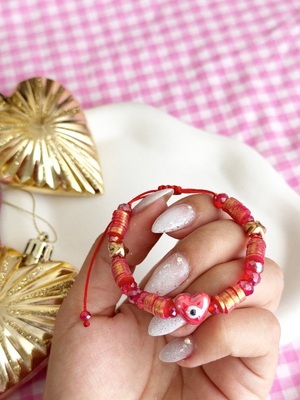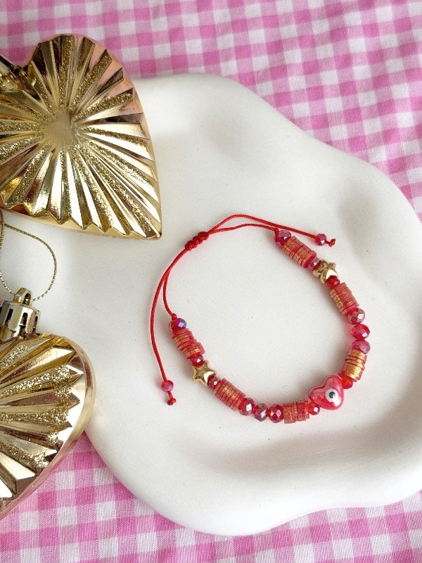 Pulsera regulable de cristal de roca con dije pasante en forma de corazon de la suerte de cerámica 🩷✨🍀