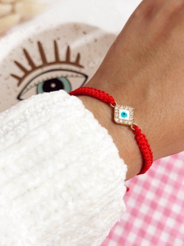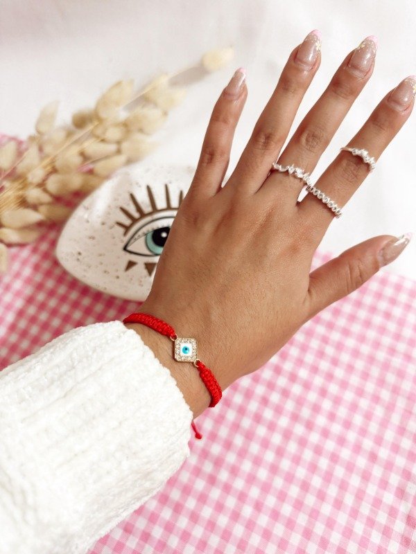 Pulsera tejida en macramé con hilo chino suave y dije de doble agarre de ojito con strass. Regulable.