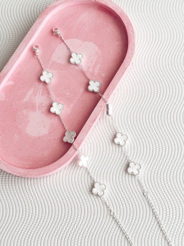 Pulsera de acero blanco ✨🤍 con flores de nácar alusivas a van cleef! 💐 Trae cadenita de alargue de 5 cm extra