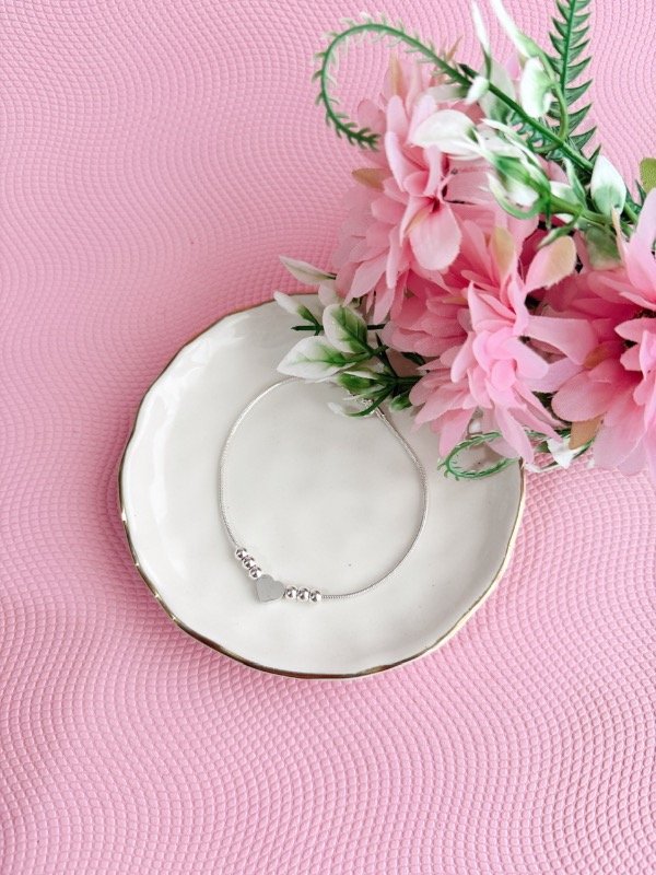 Pulsera de acero blanco ✨ cadenita al estilo cola de rata, con dije pasante en forma de corazón y cuentas 🩷🙌🏼