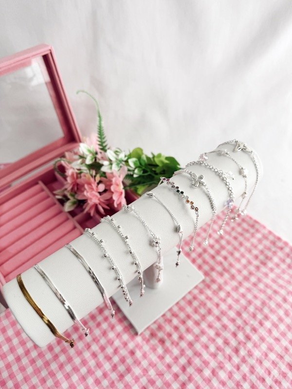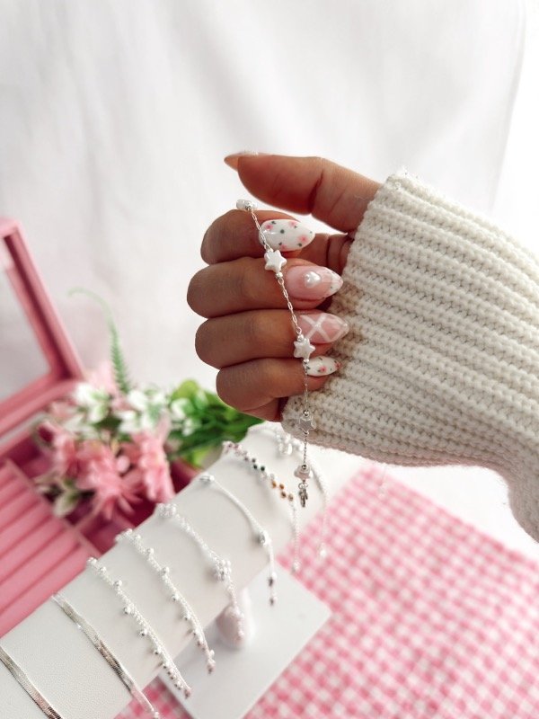 Pulsera de acero blanco ✨ cadenita súper delicada con dijes en forma de estrellas 🌟 perladas e incluye cadenita de alargue para poder regularla a gusto 🌸