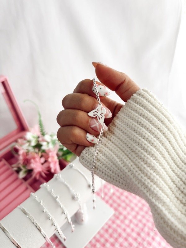 Pulsera de acero blanco ✨ cadenita súper delicada con dije en forma de mariposa 🦋