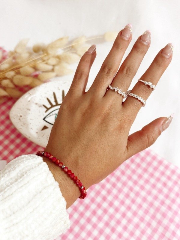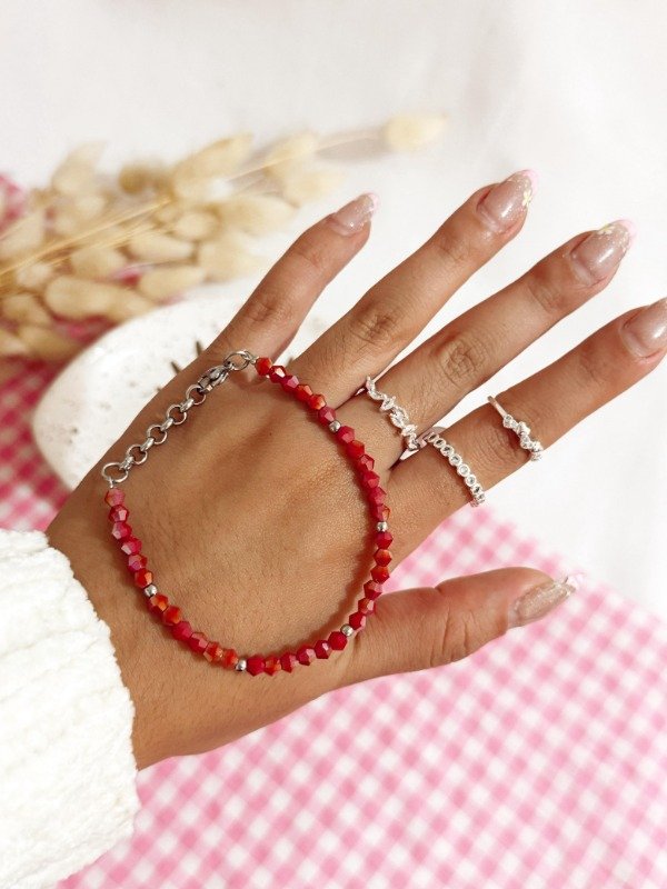 Pulsera de cristal de roca color rojo y separadores de acero quirúrgico. Terminaciones, mosquetón y cadena de acero quirúrgico.