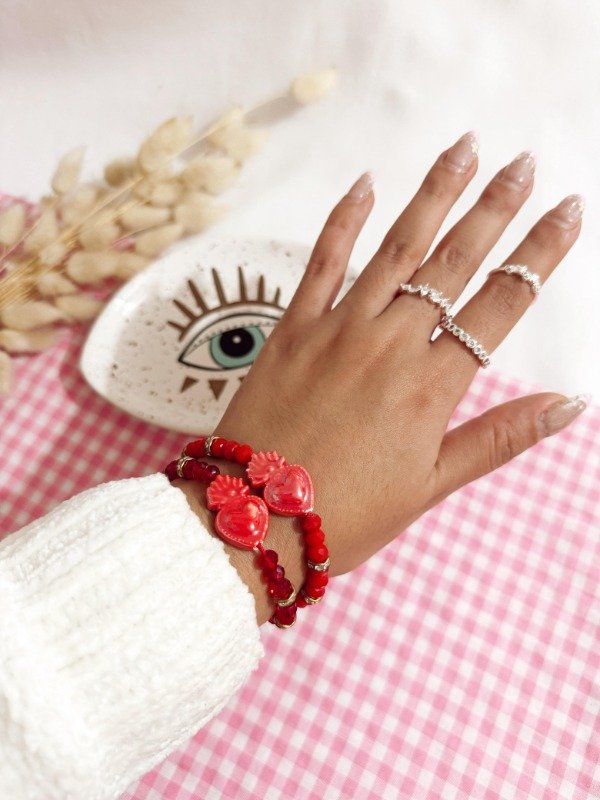 Pulsera de cristal de roca color rojo y dije corazón sagrado de cerámica. Debe tratarse con delicadeza ya que el dije no debe exponerse a golpes y usos bruscos para conservarlo mayor tiempo. Regulable.