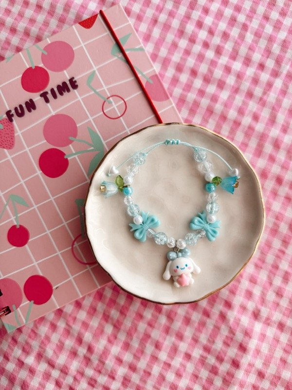 Pulsera de cuentas plásticas con dije de resina realizada en hilo con nudo regulable ✨