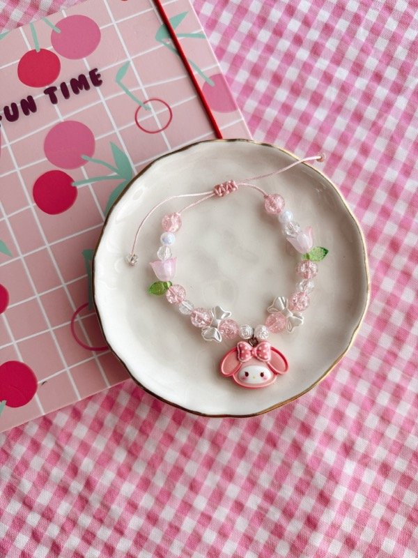 Pulsera de cuentas plásticas con dije de resina realizada en hilo con nudo regulable ✨