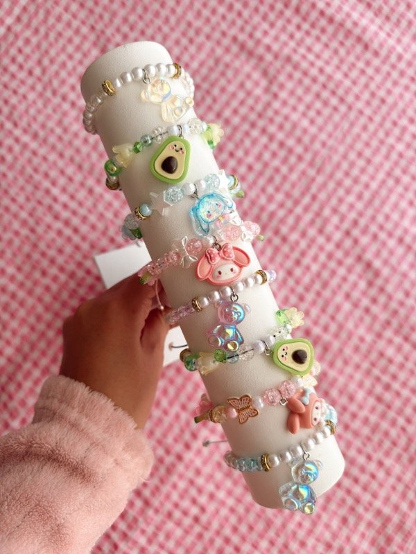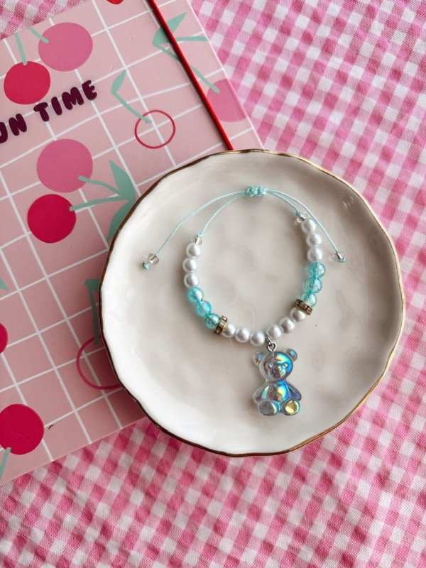 Pulsera de cuentas plásticas con dije de resina realizada en hilo con nudo regulable ✨