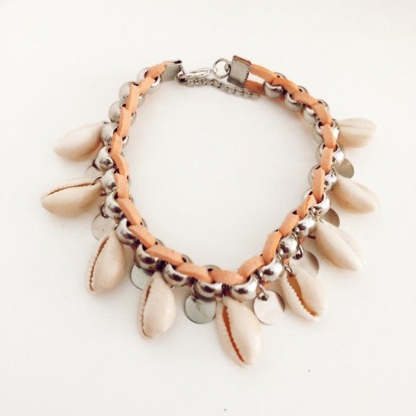 Tobillera de gamuza con cuentas plateadas y caracoles.