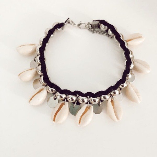 Tobillera de gamuza con cuentas plateadas y caracoles.