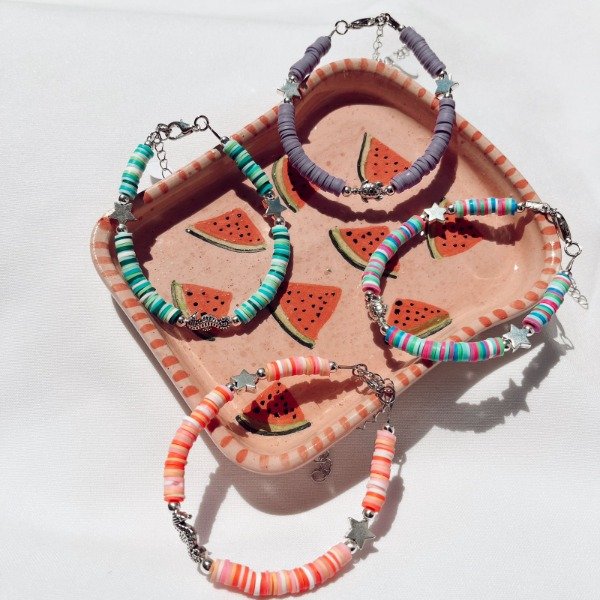 Tobilleras de fimo de colores, cuentas plateadas y dijes pasantes.